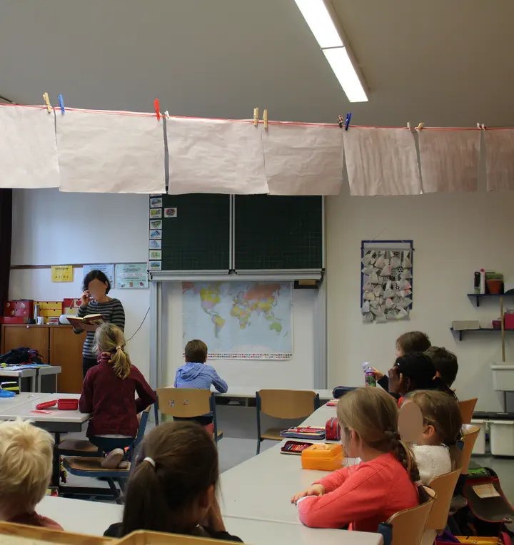 Primary and preschool life mostly consists of complex acoustic scene, which are comparable to the cocktail-party-situation. In these situations it is important to identify the target sound and to ignore distracting sounds coming from different directions. Auditory selective attention enables this ability and is therefore an important tool for the communication and development of a child. In a previous study, an experiment on auditory selective attention was developed for adults in dichotic listening environment and then extended to a binaural listening setup including room acoustic aspects to provide a realistic reproduction of the complex acoustic scenes. In this work, the paradigm was adapted for children by adding child-oriented elements and a feedback system. Further, the previous digit-word categorization task was simplified for children by substituting it with animal names. To examine the capability of the chosen stimuli an investigation with short and extended stimuli length under anechoic and reverberant situation was conducted with 24 adults.